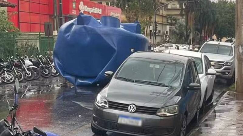 Caixa d'água despenca de prédio em obras durante chuva forte em Barretos, SP