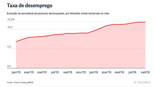 A taxa de desemprego no trimestre encerrado em setembro ficou em em 11,8%, de acordo com os dados da Pesquisa Nacional de Amostra por Domicílio (Pnad) Mensal, divulgada nesta quinta-feira pelo IBGE. A taxa se manteve no maior nível da série histórica da pesquisa, iniciada em 2012, e que foi alcançada no trimestre encerrado em agosto de 2016. Há um ano, o índice estava em 8,9%. No segundo trimestre de 2016, período que serve como base de comparação, a taxa era de 11,3%. O total de pessoas sem emprego ficou em 12 milhões.