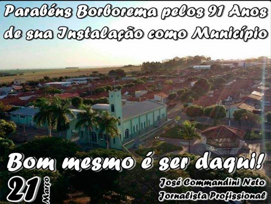 Por jornalista José Commandini Neto: Nesta terça-feira, 21/03, o município de Borborema completa 91 anos de Instalação. Os registros históricos informam que o território que hoje constitui o município inicialmente era de posseiros, depois uma grande parte passou a pertencer ao major José Claudino do Nascimento, que doou 20 alqueires de duas terras para a formação do patrimônio de São Sebastião dos Fugidos, sendo, então, sujeito à jurisdição do povo de Boa Vista das Pedras, hoje município de Itápolis.