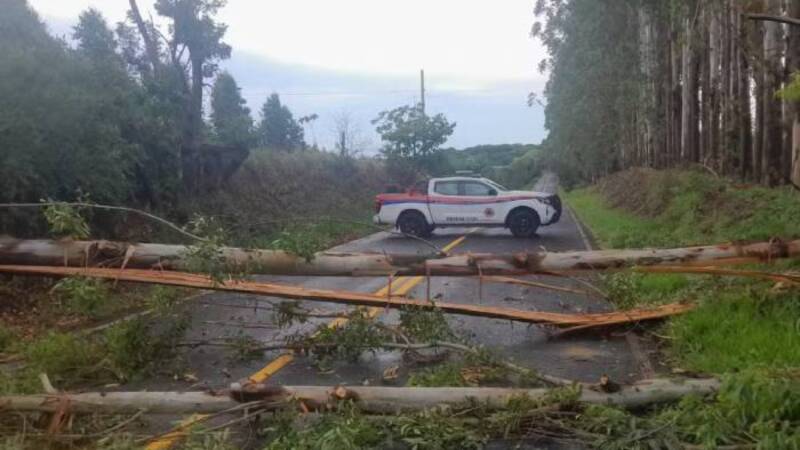 Defesa Civil faz retirada de eucaliptos que caíram durante a chuva e interditaram estrada no interior de SP